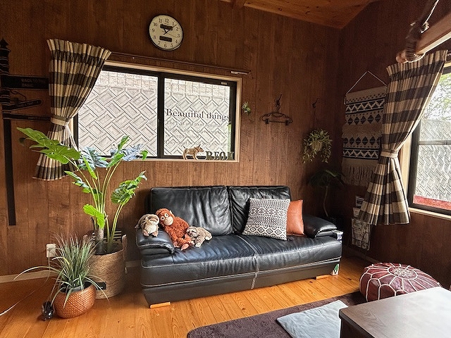 リビングの床はヒノキ、天井はスギを使用した木目調の内装で、暖かみのあるコテージです。